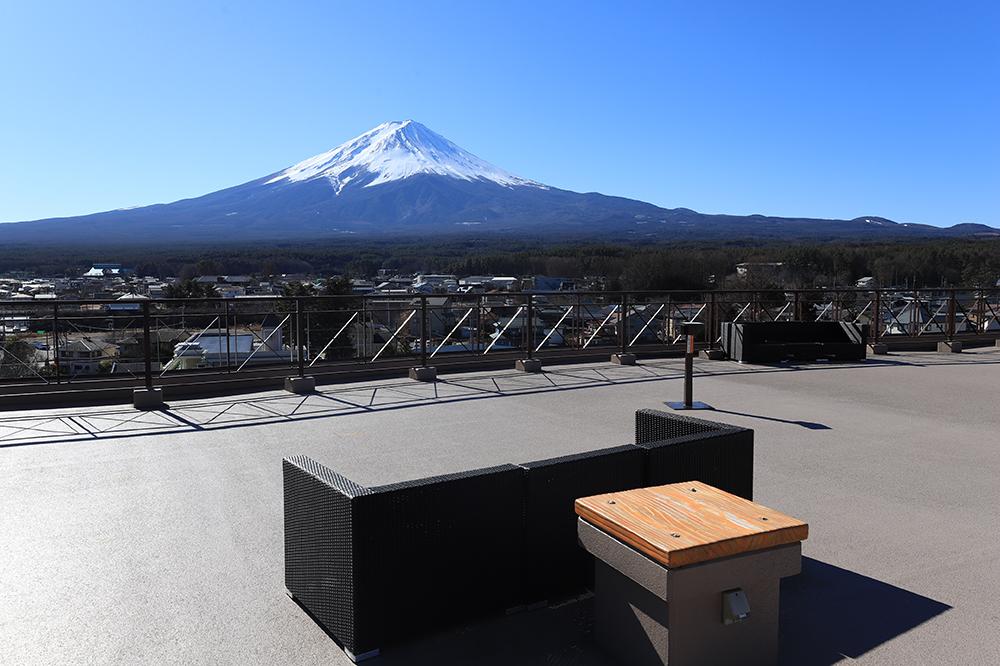 ファーストテラスとセカンドテラスの2つの展望デッキがあり、どちらからも真正面にそびえる富士山と眼下に広がる河口湖や周辺の街並みを眺めることができます。