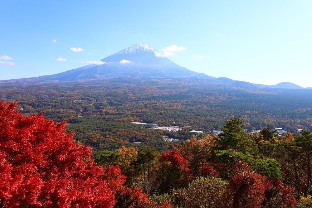 鳴沢村にある富士山の絶景が楽しめる展望台で、「紅葉台展望レストハウス」からは富士山と青木ヶ原樹海の美しい景観など、360°の大パノラマが広がります。名前の通り秋の紅葉は有名で、11月上旬ごろになると見頃を迎えた紅葉がさらに美しい景色を作り出します。
