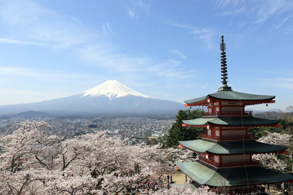 富士吉田市にある「新倉山浅間公園」は、五重塔「忠霊塔」と富士山を一緒に撮影できることで世界的に有名なビュースポットです。春には桜、秋には紅葉と、四季折々の日本らしい風景が広がり、外国人観光客からも人気を集めています。